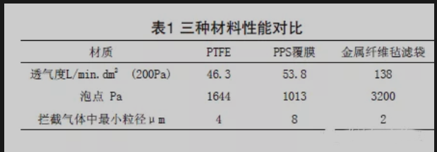袋式除塵器在高溫下工作時,由於熱膨脹效應,布袋的孔徑會增大,而金屬材料在允許溫度範圍內性狀穩定。目前排放能達標的布袋應用較多的是PPS覆膜濾料 及PTFE濾料。經檢測的濾料都是廠家稱可攔截1μm粉塵 的濾料。表1是幾種材料的對比。在有壓力的情況下,柔性布袋的泡點較金屬纖維氈低,說明氣泡較容易從布袋孔中冒出。所以在實際使用中,布袋孔徑受到溫度和壓力的雙重作用,孔徑會增大,過濾精度會受到影響。而金屬纖維氈濾料不會出現這種問題。