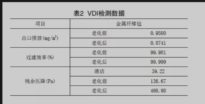 VDI檢測是國際上通用的袋式除塵器濾料檢測標準 儀如圖2)。根 據袋式除塵器技術要求(GB/ T 6719 – 2009):首先進行30次定壓(1000Pa)噴吹過程,測試和 計算濾料的初始除塵效率、出口粉塵濃度及殘餘壓降;接著進行1萬次老化 噴吹過程;然後再進行10次定壓噴吹恢複 過程;後進行30次 定壓噴吹過程,得出老化後濾料的各項數據,結果見表2。由表2中可以看出,金屬纖維氈的排放濃度可接近“零排放”。調節排放濃度可以通過調整結構來實現。