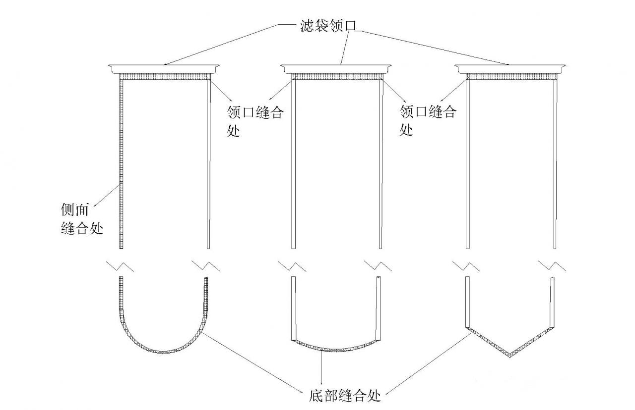 按尺寸不同濾袋通常有四個規格,分別為1號、2號、3號和4號濾袋,使用廣泛的為2號濾袋,直徑約180mm,長度810mm,過濾麵積約0.5m2,大水通量約為40m3/h。按材質常見的濾袋有聚丙烯、聚酯、尼龍、PTFE四類。濾袋由濾材和袋口固定用的領環組成,濾材和領環之間通過線縫或熱熔方式進行縫合,領環有金屬和非金屬兩類。濾材裁剪為圓柱形,底部為弧形或平底或三角錐型的。垂直側邊以及底部的縫合有線縫和熱熔兩類,典型濾袋結構示意見下圖。