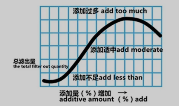助劑的添加多少與流量和濾前粘度有密切關係,添加量應控製在進口壓差均衡上升為準。過量的助劑的影響見下圖。
